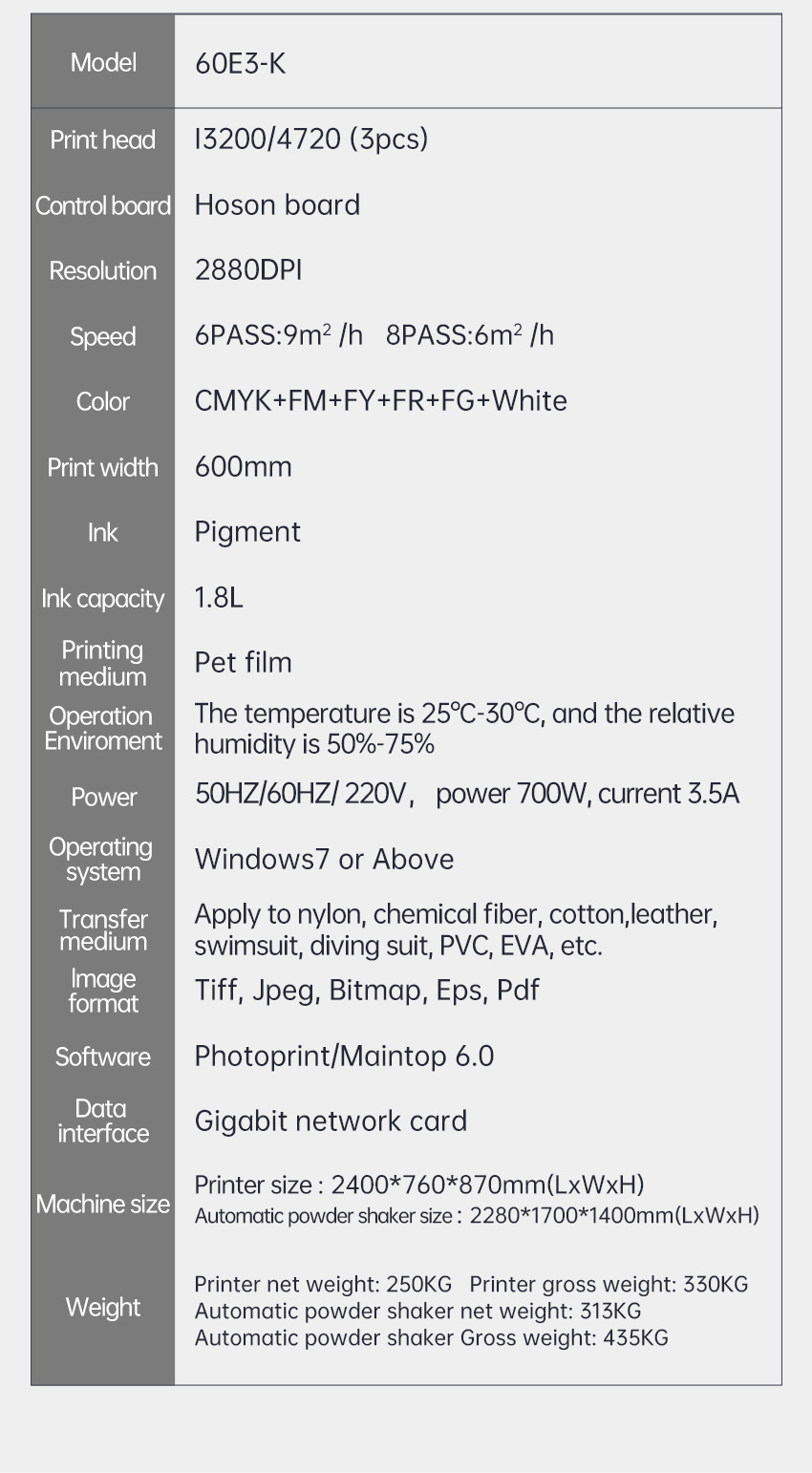 60E3-K Fluorescence DTF T-shirt Printer