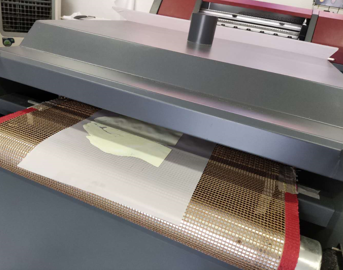 4、通過導(dǎo)帶傳送進(jìn)行圖案的熱熔粉加熱,增加圖案的水洗牢度,整個(gè)過導(dǎo)帶的時(shí)間大約2—3分鐘,導(dǎo)帶式傳送會(huì)讓加熱烘焙更加的均勻。